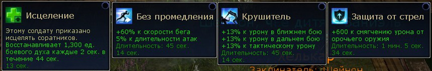 2) откат хилок снижен - хил солдатам нужен, особенно, если вы сами не имеете хилящих скилов, иногда бывает печальная ситуация, когда вы делаете где-нибудь побочный квест, а у вас случайно умер какой-то солдат или сломано знамя. Перед тем как бежать делать квест - обязательно похильте и пробафайте солдат.
